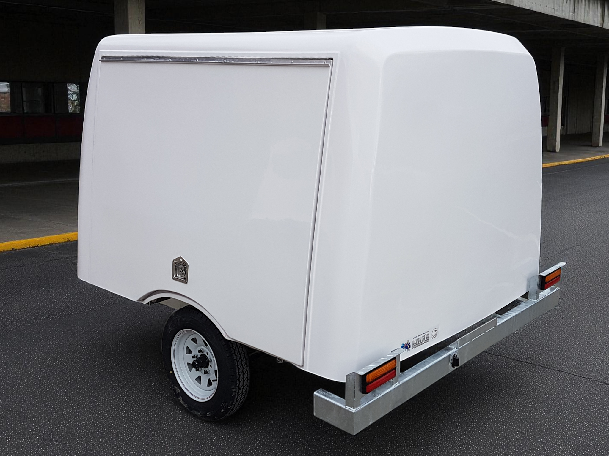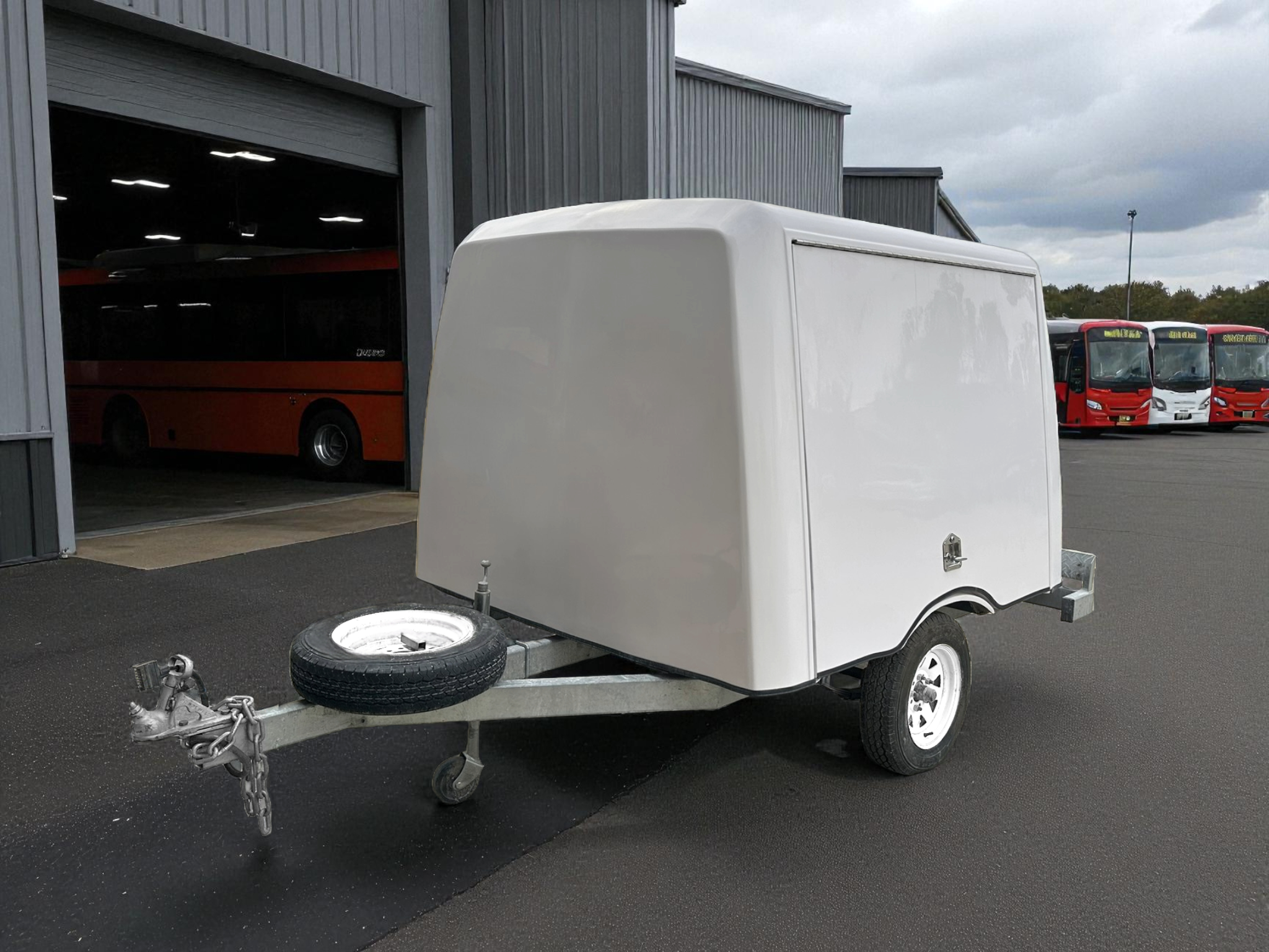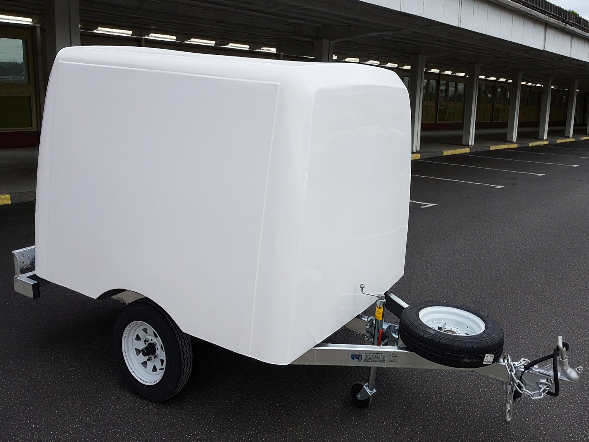King’s Fibreglass is proud to unveil our new line of luggage trailers which come in a small and large version. These trailers come standard with with a galvanized chassis, jockey wheel, spare wheel and all required lights. The body of each unit comes standard in a white gelcoat finish with either a side or rear opening door with lockable t handles providing added security to your load. These line of trailers are sure to help improve your luggage transporting needs and are suited to many forms of transportation from cars to coaches due their rugged and sturdy design along with their incredibly light weight.