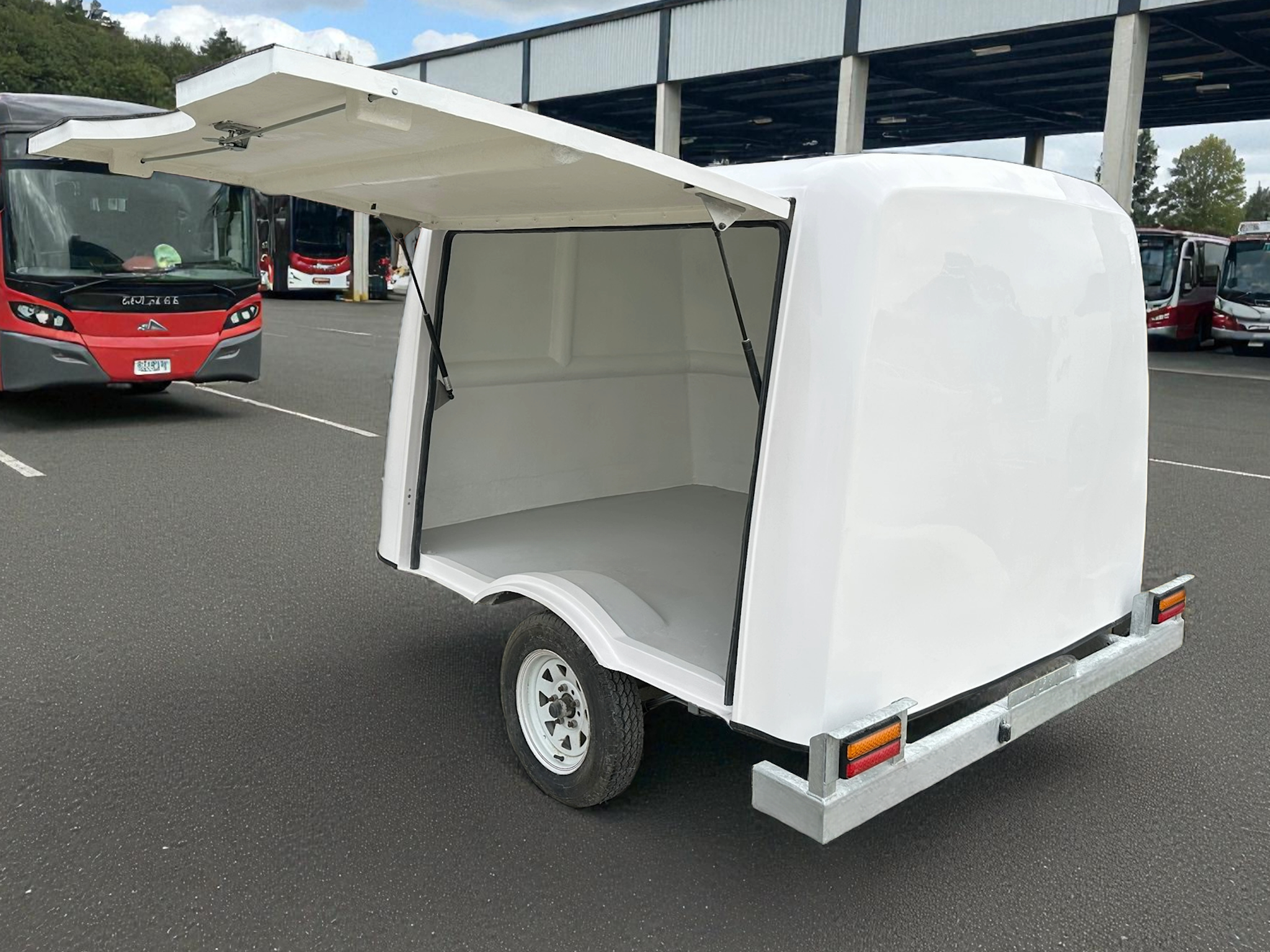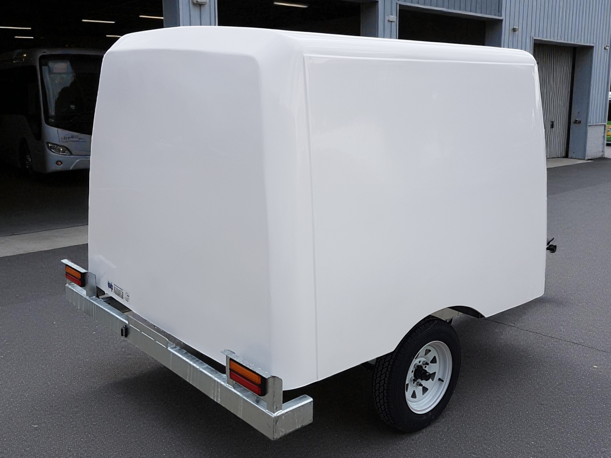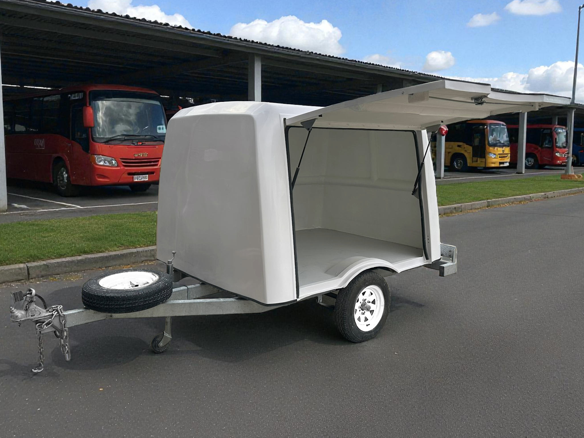 King’s Fibreglass is proud to unveil our new line of luggage trailers which come in a small and large version. These trailers come standard with with a galvanized chassis, jockey wheel, spare wheel and all required lights. The body of each unit comes standard in a white gelcoat finish with either a side or rear opening door with lockable t handles providing added security to your load. These line of trailers are sure to help improve your luggage transporting needs and are suited to many forms of transportation from cars to coaches due their rugged and sturdy design along with their incredibly light weight.